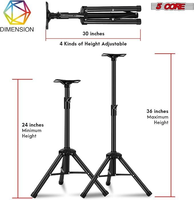 The sturdy tripod speaker stand is built for reliable performance. Made from durable metal alloy, this speaker stands for surround sound and features a 35mm pole mount insert offering universal compatibility with a wide range of studio monitors and speakers. Adjustable height from 24 inches to 35 inches (2 feet to 3 feet), this floor speaker stand offers flexibility for various setups. The satellite speaker stands supports up to 100 lbs, providing stable support for heavy equipment. Its tripod legs with anti slip base ensure maximum stability on any surface, while the foldable design makes it easy to transport. Whether for live performances, evens, or studio use, this small speaker stands delivers both durability and convenience for professional audio setups. |