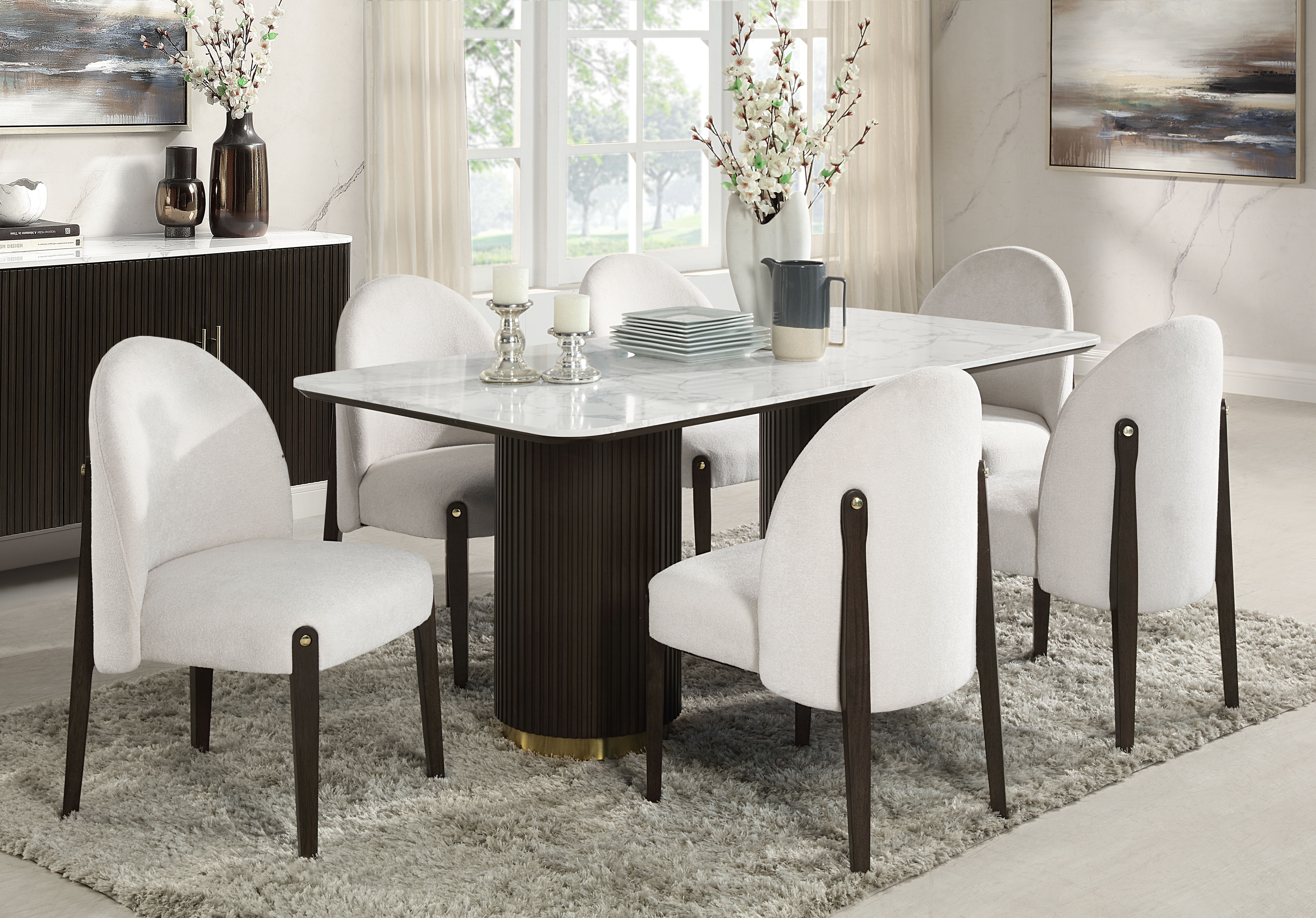 Finished in rich espresso, the composite wood and MDF base contrast beautifully with the marble, enhancing the table's luxurious appeal.
