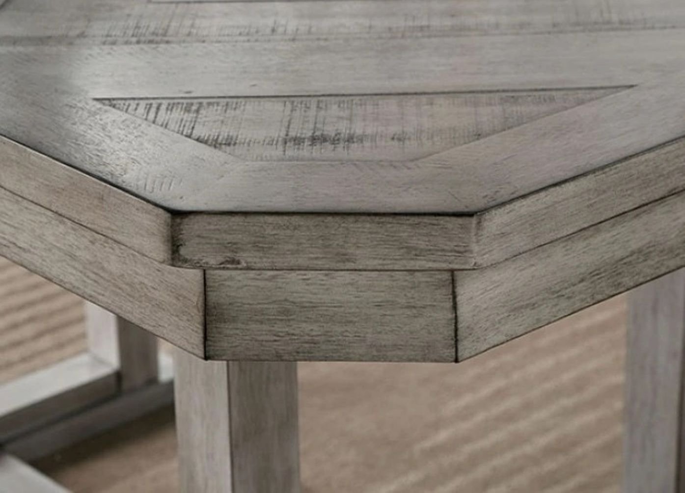 Product Description:-This distinctly shaped table will help you build an outstanding dining space. The gray table top features a hint of warm tone, displaying a diamond wood grain pattern that plays off the cut-out corners. Playing off the same hue is the soft gray linen-like fabric, offering comfortable seating on the matching chairs and bench(Sold Separately). The ladder back design shows protrusions on the sides of the chair; it's an element found on both ends of the trestle base as well, a sort of rugged style cleverly complemented by the wire-brushed frames.Dimensions:-Dining Table: 60"L X 36"W X 30"HListing Includes :- 1pc Dining Table Only.Chairs And Bench - NOT INCLUDED.Simple assembly require.Features:-RusticGrayDiamond Wood Grain PatternWire-brushed FinishTrestle Base