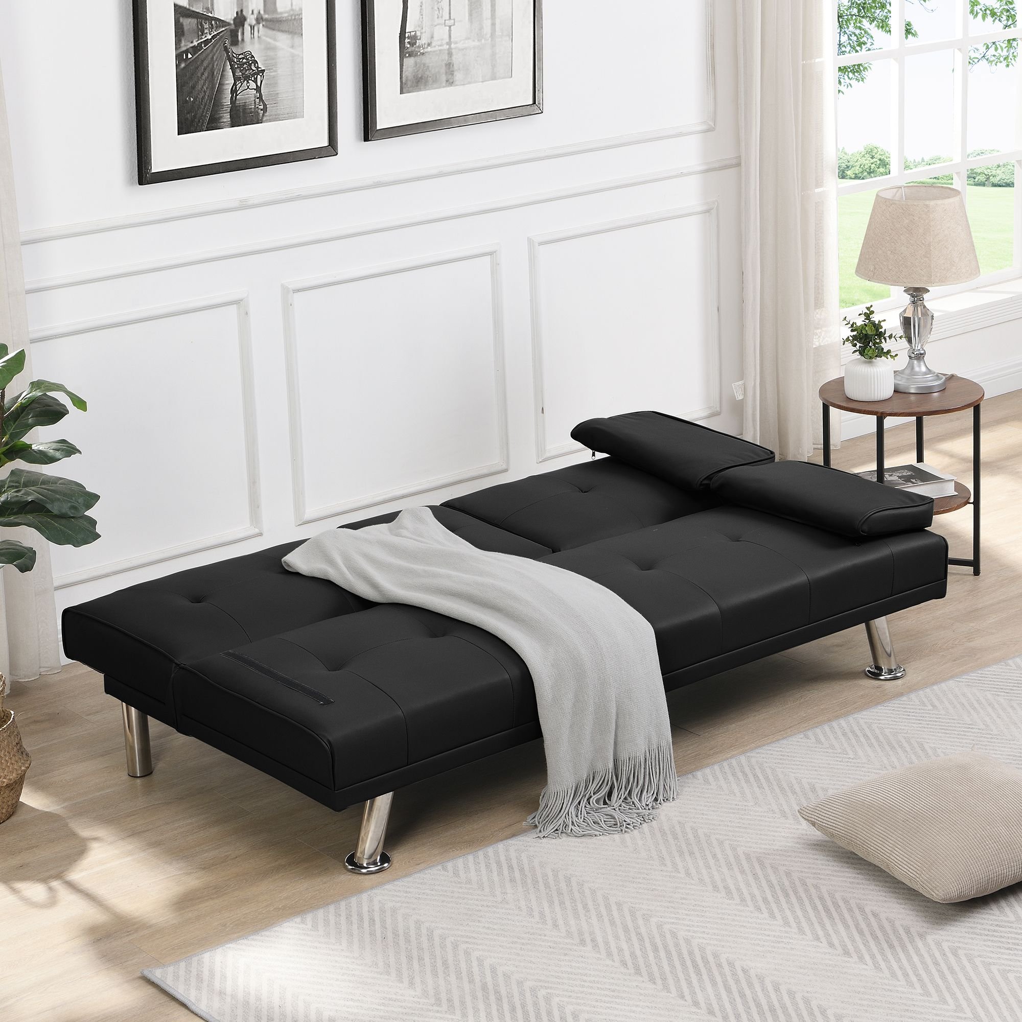 Sofa Bed with Armrest two holders WOOD FRAME, STAINLESS LEG, FUTON BLACK PVC Sofa Bed with Armrest two holders WOOD FRAME, STAINLESS LEG, FUTON BLACK PVC Sofa Bed with Armrest two holders WOOD FRAME, STAINLESS LEG, FUTON BLACK PVC