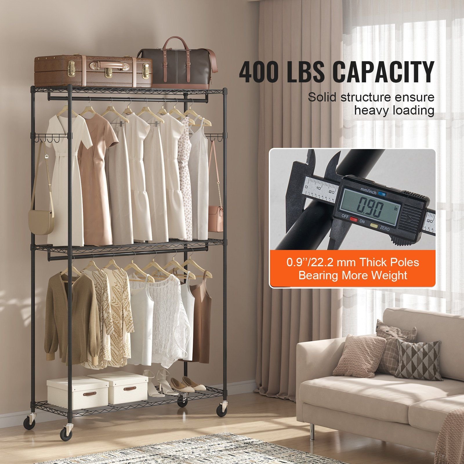 3.Sturdy & Durable: With a thickened steel diameter of 0.9 inch (22.2mm), this heavy duty garment rack can bear the weight of up to 400 lbs effortlessly. It provides secure and reliable support for your entire clothing collection, ensuring garments are held securely and well-supported.