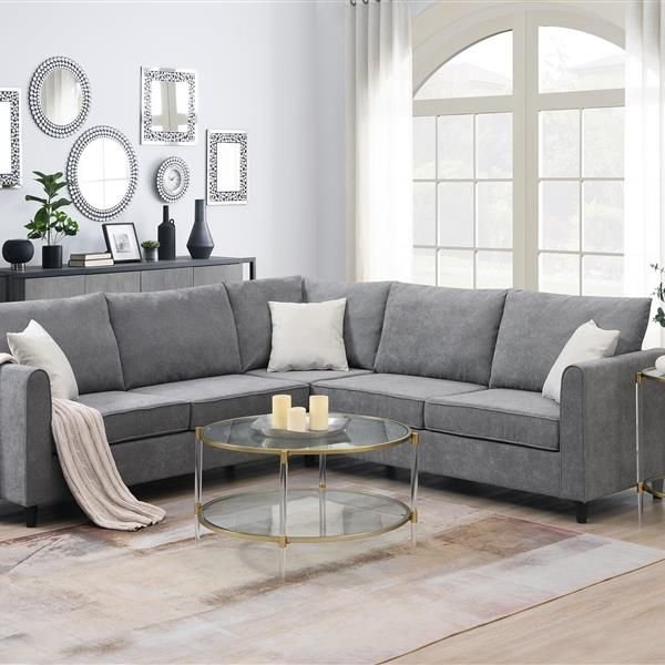 Product DescriptionFor a living room with style, comfort and spacious seating, the 3-piece sectional sofa will satisfy your needs. This sectional features gray upholstery that's both versatile and trendy. And, when it comes to comfort, delivers with its huge seating area and extra accent pillows. With all these great features, you're in for a well-balanced room with character.FeaturesProduct TypeSofaProducts includedLeft-Arm-Facing Loveseat;Right-Arm-Facing Loveseat;WedgeSeating Capacity5Upholstery Material100% polyesterFrame MaterialSolid + Manufactured WoodLeg MaterialPlasticSeat Fill MaterialFoam; Pocket springBack Fill MaterialPolyesterRemovable CushionsYes.Seat,backrestReversible CushionsYes.Seat,backrestPillows IncludedYes,3 includedProduct CareLightly brush or vacuum frequently to remove dust and grime. Spot clean using a mild water-based solvent. Pre-test cleaning methods on a hidden surface. A professional cleaning service is recommended for an overall soiled condition.Arm TypeShelter ArmSeat StyleMultiple cushion seatBack TypeSemi-Attached PillowsSupplier Intended and Approved UseResidential UseCountry of OriginChinaAdult Assembly RequiredYes,Suggested of 2 PeopleAdditional Tools RequiredTools includedProduct DimensionsOverall91*91*33.5"(L*D*H)Loveseat dimensions57*28.5"(L*D)Back Height - Seat to Top of Back16.5"Arm Height - Floor to Arm25.3"Seat Height- Floor to Seat16.9"Leg Height - Top to Bottom3.9"Cushion thickness6"Pillow size14.5*14.5"Weight Capacity300lbs / seatNoticeThe packaging of the product package may be updated at any time, please refer to the actual product received.All colors on our website are for reference only, actual product colors may vary a little bit, due to different colour settings of every screen device.Please note: most of our sofas are hand-measured, therefore the dimensions are for reference only, and may marginally deviate.The cushions are vacuum-packed. After opening the package, please allow 72 hours to let it come back to its original shape.Keep it looking its best√ Blot spills immediately with a clean, absorbent white cloth.√ For indoor use only.√ Avoid direct sunlight.√ Do not leave newspaper or other printed material lying on surface.√ Dimensions of bench-made upholstery may vary slightly.√ Vacuum regularly.√ Spot clean using distilled water and water-based cleaning agents, foam or mild water-free cleaning solvents.√ Always test a small inconspicuous area first.Sectional Sofa Pieces: This sectional features gray upholstery that's both versatile and trendy. Includes left-arm-facing loveseat, wedge and right-arm-facing loveseat, 3 pillows are included in the package to meet various daily use needs.Comfortable design: Wide track armrests, cushions and legs for a clean, modern aesthetic. Comfortable foam, pocketed spring-filled pads supported by a curved spring structure. Heavy-duty S-shaped lines span the frame from front to back, providing even comfort and support throughout the seating area, preventing sagging.1 % Polyester upholstery: This easy-care fabric boasts a soft feel, yet it's tough enough for extensive, everyday use.High-quality Solid Wood: Frame joints are reinforced with corner blocks and heavy-duty metal fasteners for added strength and stability.Easy to Assemble: This L-shape sofa needs to be assembled, instructions manual and tool included, Overall size: 91"(L)* 91"(W)"* 33.5"(H).In order to facilitate the assemble, we use the plastic legs and strong semi-attached cushions to avoid too many accessories to install.Package: This sofa will be shipped from the US in a total of 5 packs.